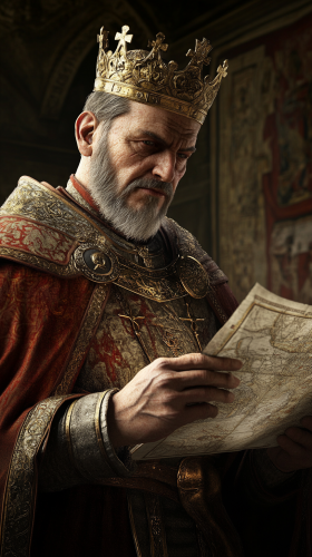photograph of realistic medieval fantasy princess, tall woman in her early twenties, fair skin, blue eyes, long fiery red hair, rounded features, heart shaped face, inside regal palace talking to captain of the royal guard, HD --ar 16:9