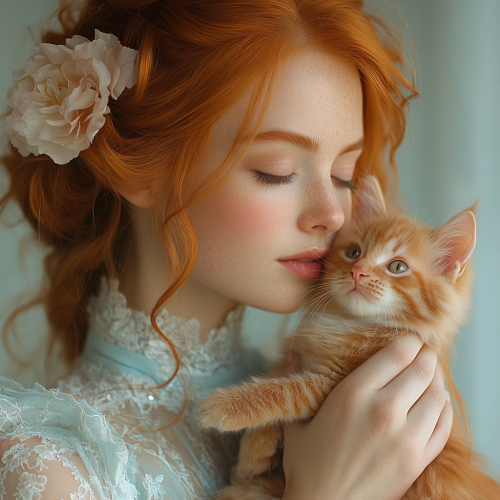 a beautiful red-haired woman is holding a red-haired kitten in her hands, she is wearing a blue dress, a gentle pastel gradient background is behind her, a flower is in her hair --s 750