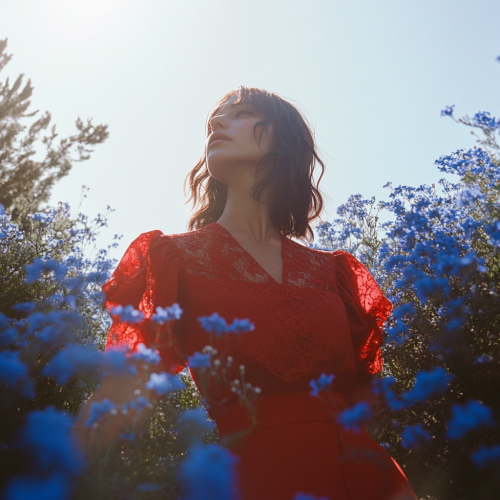 Low angle static shot: The camera is angled at a woman wearing a red dress. She is standing in a garden full of blue flowers. The clear sky is in the background, with warm sunlight shining over her head