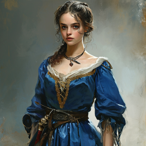 dumpy looking female in medieval dress, young woman, ugly, blue dress, dagger on waist --v 6.0