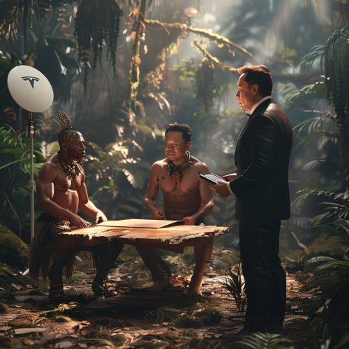 3 amazon jungle tribe members sitting at a wooden table in the distance watching a tablet with a minimal white circular wifi dish standing next to them with elon musk standing far away from them with a suit on looking at them in shock and stress, ultrarealistic, 8k, --ar 1:1 --v 6.0