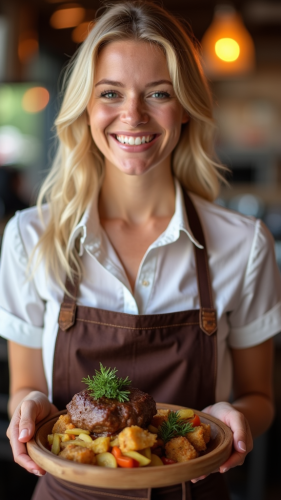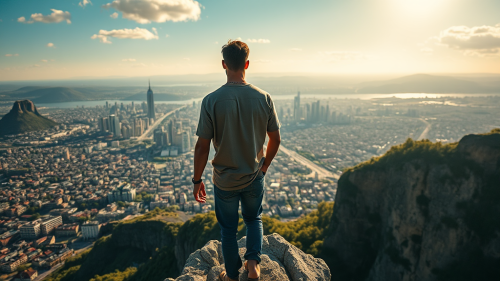 Create a full-body image of a seasoned, adventurous woman captured in the act of taking pictures with a high-end Sony DSLR camera. Her golden brown hair is elegantly tied back to keep her view unobstructed, and her light honey-brown eyes are sharply focused on her subject. She wears a practical yet stylish outfit suitable for an urban explorer, complete with durable yet fashionable boots and a camera strap slung confidently across her shoulder. She stands amidst a vibrant cityscape, with hints of distant skyscrapers and the city's pulse around her. The setting sun bathes the scene in a golden hue, highlighting her form as she composes her shot, her posture reflecting both her experience and her passion for photography.