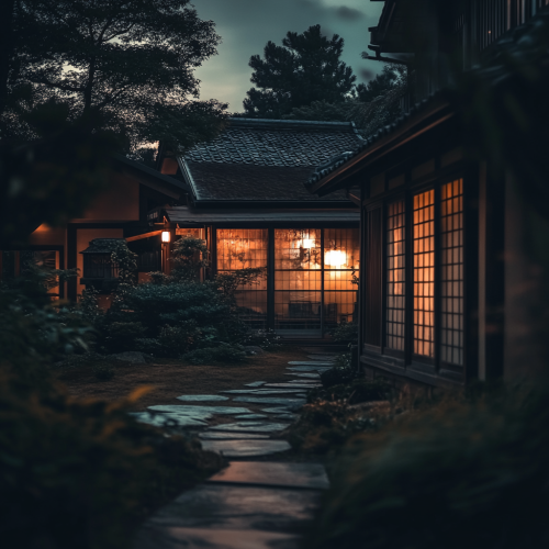 architectural photorealistic exterior of a traditional japanese house with an exterior engawa, cool natural scene, Sony Alpha 7R V, 35mm lens, f/2.6, soft moon light, shallow depth of field, subdued colors, ISO 250, 1/60 sec --style raw --stylize 50 --v 6.1