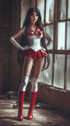 Photography Sony A2 85mm f/1.8 The character is a Sailor Moon, and agile with a confident and determined expression. He has long dark hair styled in two prominent ringlets. Her outfit consists of Sailor Mars,. She wears sheer tights and bold red platform shoes, which add a touch of style to her combat-ready look. In dynamic action stances, he displays his agility and combat skills, emphasizing his athleticism and battle readiness --v 6.1 --ar 9:16