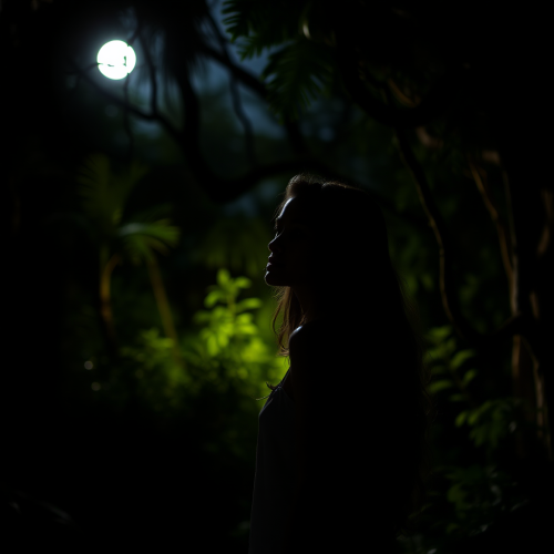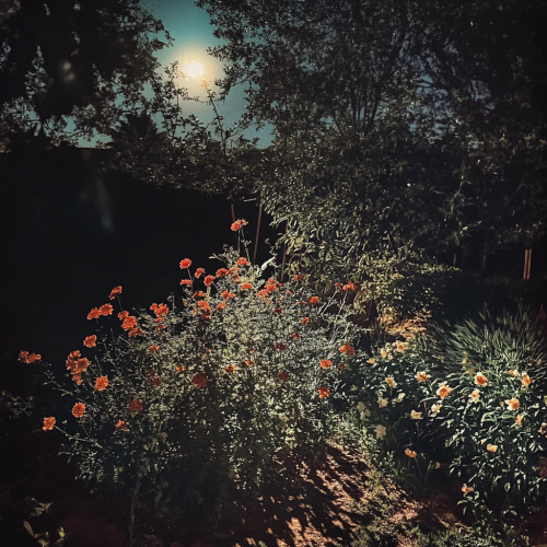 A serene night garden with the moonlight casting soft shadows on the flowers and plants, creating a calming and peaceful night scene taken with an iphone 15 pro