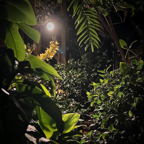 garden at midnight, with soft moonlight illuminating the plants, and a peaceful, serene atmosphere perfect for late-night contemplation taken with an iphone 15 pro