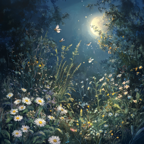 Design a mystical nighttime scene where moonlight illuminates the soft textures of chamomile and lemon balm in a garden. Tiny moths and fireflies add an ethereal glow