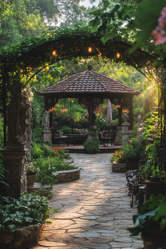 Depict a Western Gothic home decor themed garden, where silent sentinel settings create a mysterious, guarded space. Stone statues of knights and mythical beasts stand at intervals around the garden, half-hidden by dark foliage and shadowy, flowering vines. A central, circular path leads to a secluded seating area under a wrought iron gazebo, where one can sit surrounded by the silent guardians. Soft, solar-powered lights illuminate the path and statues, casting dramatic shadows that shift with the passing moon. This garden should be a place of quiet reflection and protection, where the sentinels keep watch over night and day. Neat and organized. Camera: DSLR - Canon EOS 5D Mark IV. Lens: Canon EF 24-70mm f/2.8L II USM. Composition: Wide shot, room-centered, horizontal orientation, balance between furniture and space. Film: Digital, high resolution, color profile sRGB. Camera settings: ISO 400, f/2.8, 1/60 sec. --ar 2:3 --v 6.1 --s 250