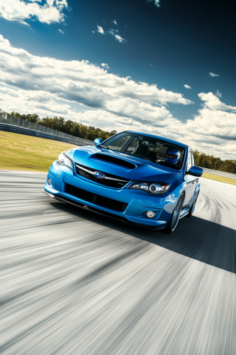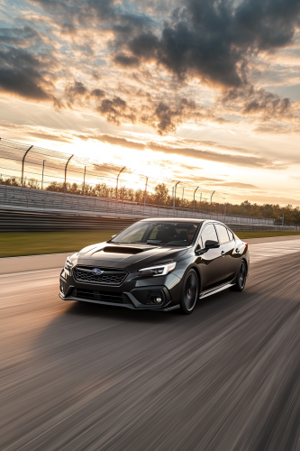 Subaru Impreza Hatchback driving on a racetrack, sunset, motion, shot on a Sony mirrorless camera, DSLR, 85mm lens f/8, ultra detailed, 8k, --ar 2:3 --v 6.1