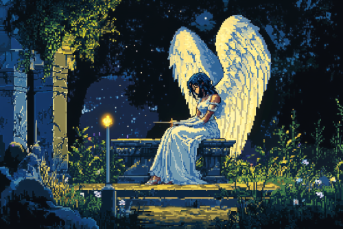 pixel art, game art, 8 bit, 80s anime-style still depicting a beautiful swordswoman with huge angel wings and a white gown, sitting on a small table in a garden at night, in the style of Yoshiaki Kawajiri, Tsukasa Hojo, Toshihiro Iida, yellow and blue color scheme, dynamic contrast, highly detailed. --ar 3:2