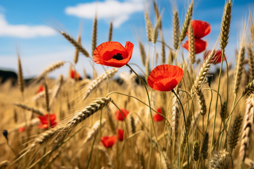 field of grain, just before harvest, with some poppies, muted colors, wide angle, shot with sony A7 RIV, --ar 3:2 --uplight