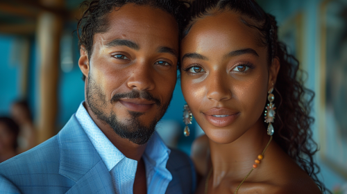 full body couple of latin models, happy, look at camara, no black people, modern, fashion, urban elegant, clothing full blue. shot with Sony Alpha a9 II and Sony FE 24mm f/2.8 G lens, natural light, hyper-realistic photography, ultra-detailed. 8k resolution, 3d render --ar 16:9 --s 750 --v 6.0 --style raw