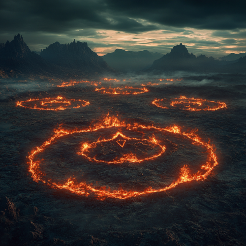 an enormous wide open landscape that resembles a vision of hell. Hellfire a destruction are everywhere. Evil red magical cult symbols are burned into the land everywhere you look giving the feeling of despair and damnation. Highly realistic. Dynamic cinematic shot.