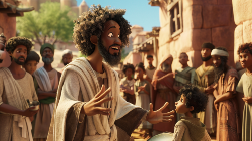 a light hearted cartoon movie poster of a black man in ancient Galilee wearing a linen robe and natural woolly hair, talking to a small group of men and a few children, a detailed animation --v 6.0 --ar 16:9