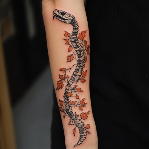 a left forearm tattoo if a rattlesnake skeleton wrapping around the arm with the head striking down towards the wrist, mouth open and fangs out. Inside the length of the skeleton are fall leaves, stuffed between the ribs and poking out here and there, tendrils of vines also creeping through the bones