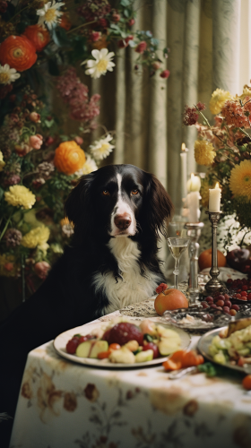 A dinner table bounty still with fall florals. Similar to thanksgiving, with an American black labrador sitting on the floor. Style of Barry Lyndon by Stanley Kubrick 35mm fuji film --ar 9:16