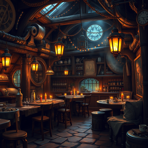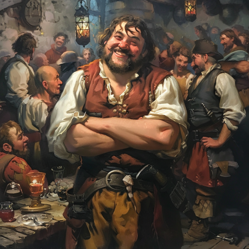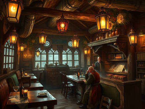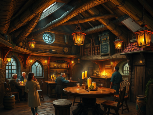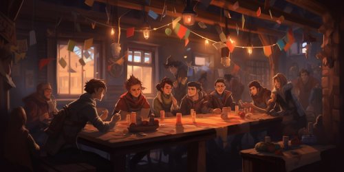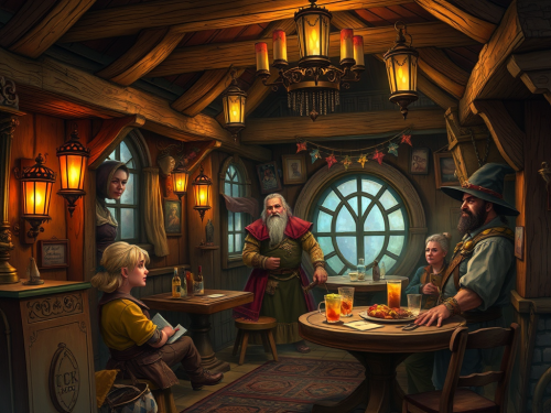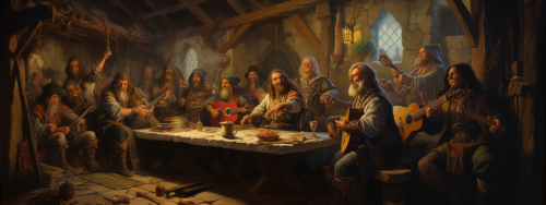oil painting a handsom bard plays a lute in a tavern. fantasy style. Elves, gnomes, dwarves and humans sit around drinking ale and talking to each other. jovial mood --ar 24:9 --s 50 --v 5.2
