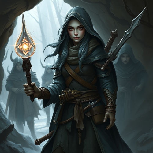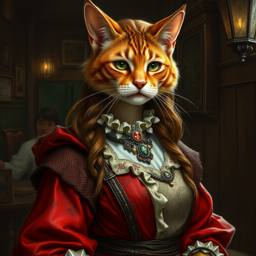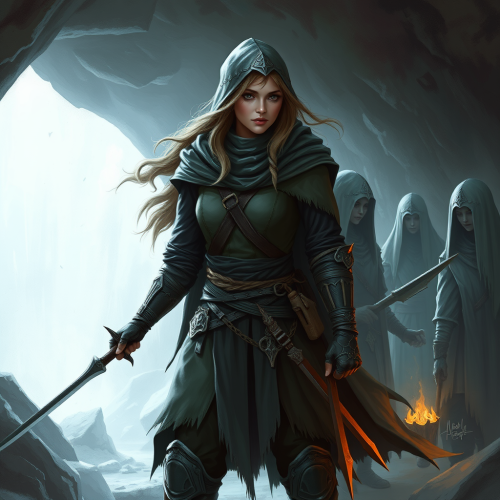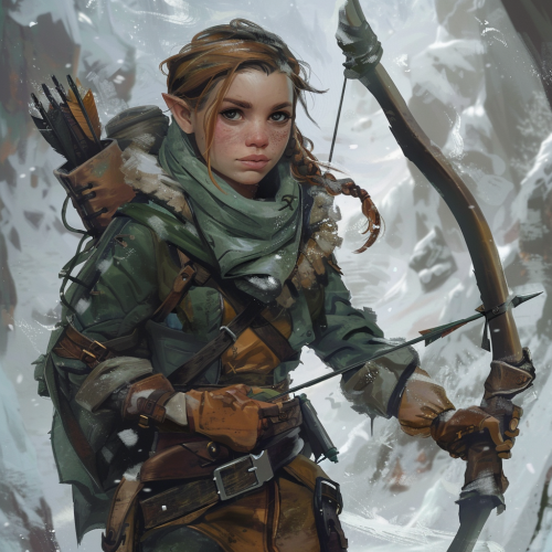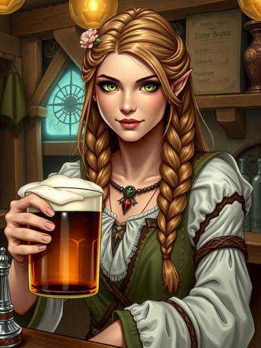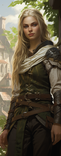 A skilled and mysterious fantasy human ranger woman standing in a tavern. She has wavy, tousled blond hair parted into two long braids, piercing green eyes, and a strong, athletic build. Her attire is a mix of leather armor and a puffy white blouse designed for stealth and agility. A longbow is slung across her back, with a quiver of arrows at her side. She wears a cloak adorned with subtle, mystical runes. She has a keen, watchful expression, but a persuasive and welcoming face. The atmosphere is serene but filled with an air of danger, as if she is both protector and hunter. The art style is detailed, with a touch of realism and fantasy, inspired by high fantasy illustrations