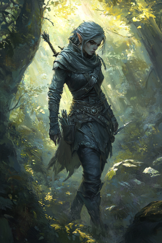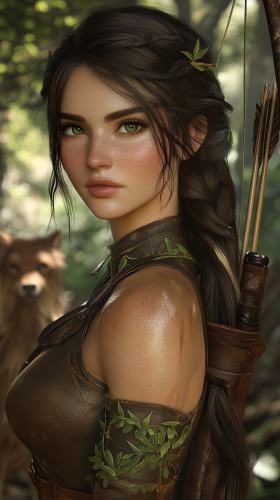 A strong and graceful Forest Ranger with long, flowing dark hair tied back in a practical yet elegant braid, and expressive green eyes that radiate confidence and a deep connection with nature. Her skin is sun-kissed, and she wears earthy-toned, realistic leather armor with intricate leaf and vine patterns. She carries a finely crafted bow and quiver of arrows, with a calm, focused expression. She has a gentle, harmonious connection with the animals around her, communicating with them as they move beside her. In a semi-realistic Pixar style, with lifelike textures, detailed natural clothing, and dynamic forest surroundings filled with lush greenery and wildlife. --ar 9:16