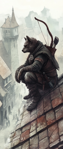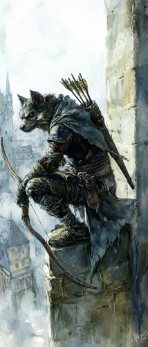 A gnoll ranger with a bow on his back, crouched on a rooftop keeping watch in a medieval city. The mood is eerie and etherial. Dark Fantasy setting. Watercolor art style with soft washes of color and fluid details. The watercolor background is a medieval city with partial white space. --ar 3:7