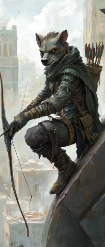 A gnoll ranger with a bow crouched on a rooftop keeping watch in a medieval city. The mood is eerie and etherial. Dark Fantasy setting. Watercolor art style with soft washes of color and fluid details. The watercolor background is a medieval city with partial white space. --ar 3:7