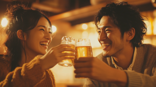 A traditional Japanese tavern setting where two Japanese friends, a man and a woman in their late 20s, are celebrating with a toast. Their faces beam with delight as the warm, inviting light highlights their expressions. The cozy surroundings of the izakaya, with its wooden accents, provide a perfect backdrop for their jovial evening.
