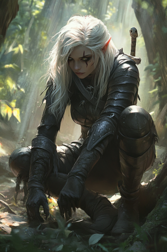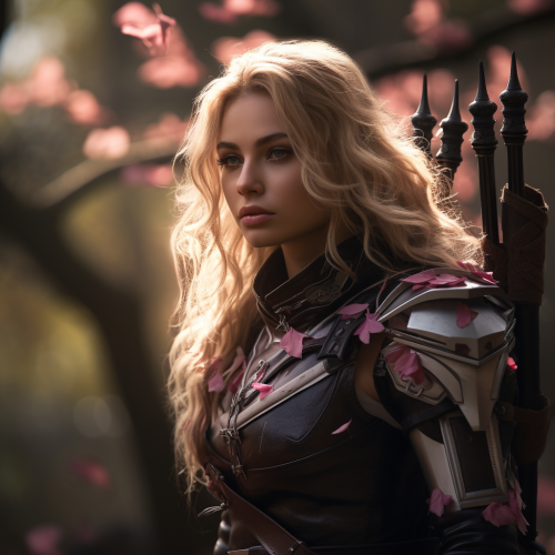 a blonde female ranger with a bow in a forest with pink leaves, dark fantasy aesthetic, high detail, hyper-realistic.