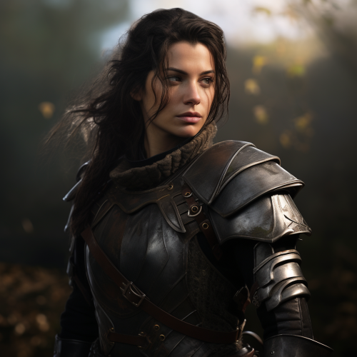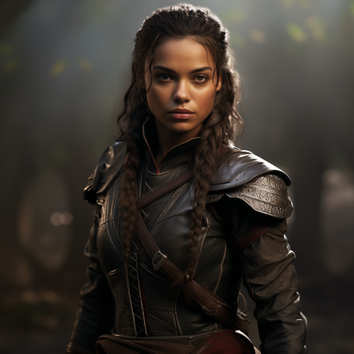 a realistic female lord of the rings style ranger with braided hair and dressed in leather with a face scar