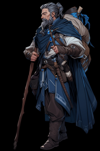 full body image of a heavey set Ranger dressed in fark blue, he has a cane and a peg leg, brown greying hair and beard, Dungeons & Dragons, D&D, isolated on a black background, art style by Greg Rutkowski and Charlie Bowater --ar 2:3 --niji 5
