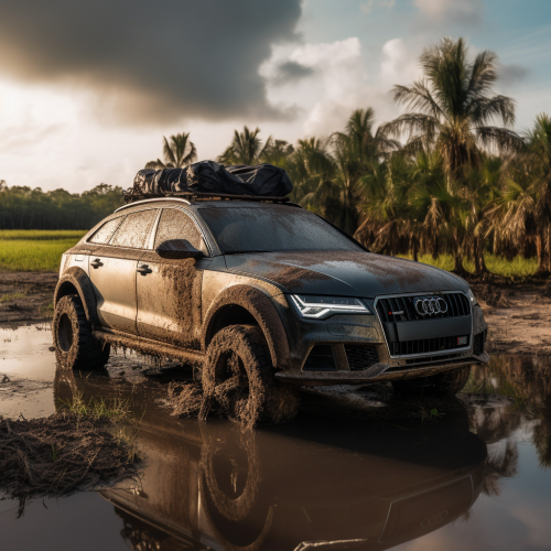 2017 black audi a7 with off road tires and a lift kit, car is outfitted with a snorkel and overlanding tires, lift kit, machine gun on roof, post apocalyptic miami beach, broken neon, lush art deco decay, hyper realism, real photo, ultra-realism --v 5.0