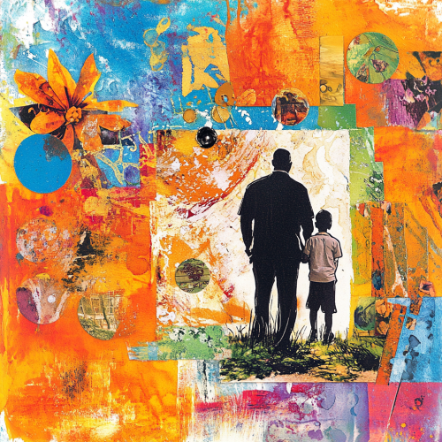 Día del Padre (Father's Day) a heartfelt card for your father or father figure, using bright colors and symbols that represent your unique bond, a photo mixed media collage with a card, ink pen, memories, watercolor illustration