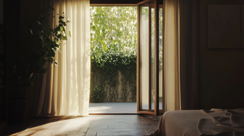 An ultra realistic photograph of a modern private room garden view from the room gallery. Day view. of The image was captured using a Canon EOS R5 with 50mm --ar 16:9