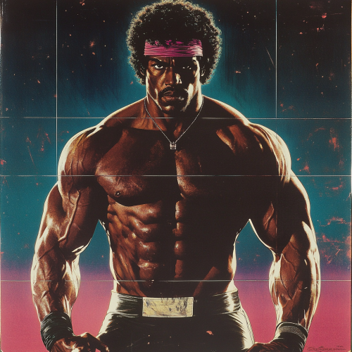 extremely over-the-top '80s action movie poster, an extremely muscular Ethiopian with a headband who makes his way to America to become a sports champion, extremely high body count