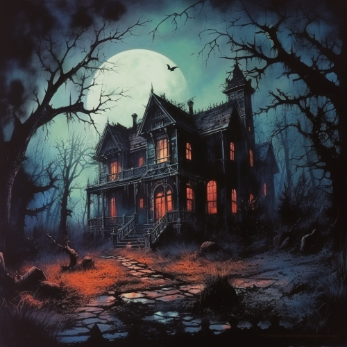 80s horror movie poster, vintage art, airbrush, faded, photorealism, hord of zombies, haunted house, dark, creepy, candle light, moon,