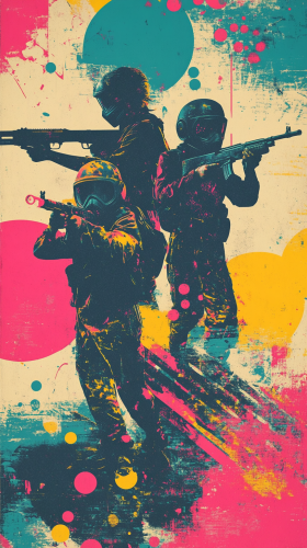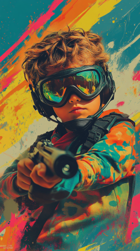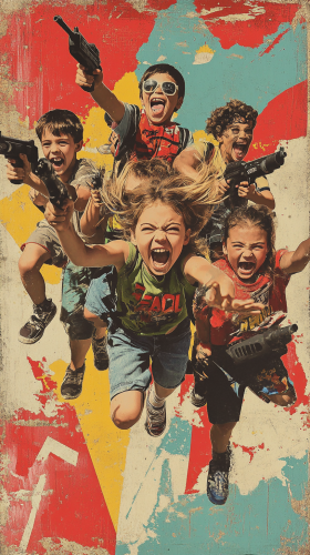 fun and dynamic invitation to a kids birthday party to play paintball that looks like a retro movie poster with a classic collage style, 80s poster, kids, fun, paint ball, --ar 9:16