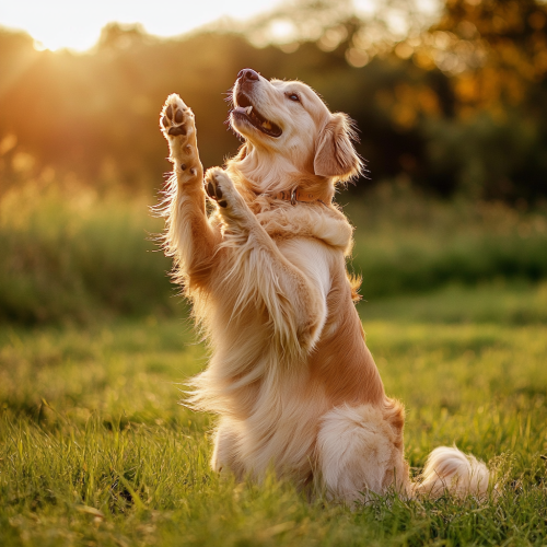 Pet magazine photography shows a golden retriever sitting on a grassy field. The dog is very happy and lifts its front paws, the dog wags its tail, feeling very happy. Its fur is illuminated by light, fluffy and soft, and the light is bright. Easy and enjoyable, commercial photography, Fujifilm natural, precise details, high-definition texture --style raw --v 6.1
