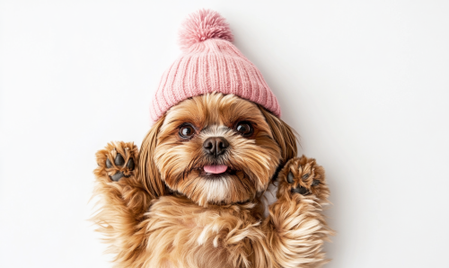topview portrait photograph of a brown fluffy shih-tzu dog with pink beanie, he is lying his back on the floor, variety posture, funny expression, isolated on white background --ar 5:3 --style raw