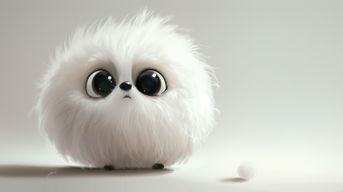 fluffy little dog with gigantic eyes, round body, cartoonish, full body from head to toes, style mandy disher, background white --ar 16:9 --v 6.0