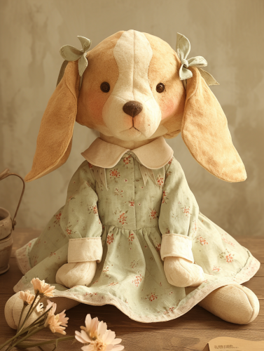 a golden labrador retriever dressed as easter bunny rabbit in style of fabric doll, wool, warm spring colors, miniature display, front view --ar 3:4 --stylize 250 --niji 6