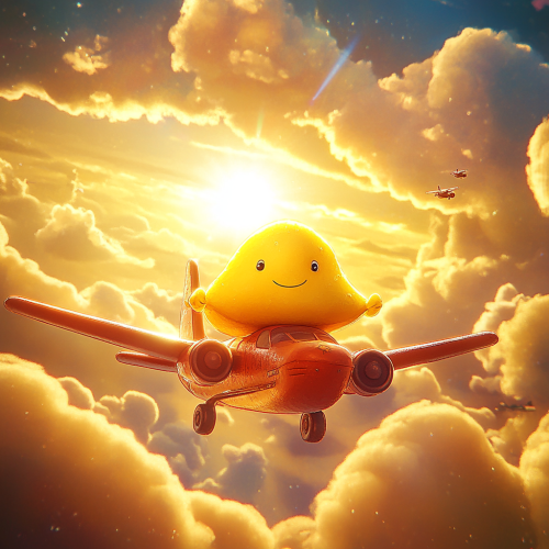 A whimsical yellow modak sitting on a flying airplane, vibrant realistic sky with fluffy clouds, bright sunlight illuminating the scene, joyful atmosphere, pixar style --ar 1:1 --s 150 --no text
