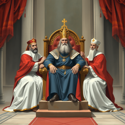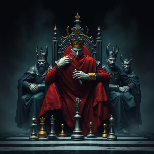One male, balding elderly man, right eye with golden glow, golden aura, sitting posture with left hand across chin, smiling expression with right corner of mouth upturned, wearing ochre robes, multiple pyramids of golden light visible behind elderly man's back --ar 3:2