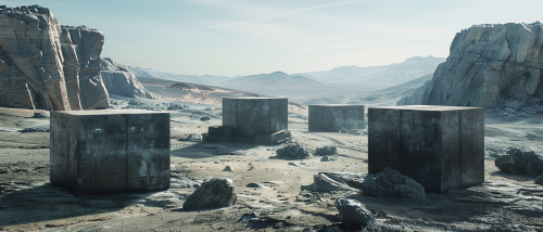 Four rectangular shapes of dark cement in the middle of a semi-desert landscape and some small rocks, in different locations, a majestic cinematic scene, cinematic details Blackmagic Ursa Mini Pro 12K, --ar 7:3 --v 6.0