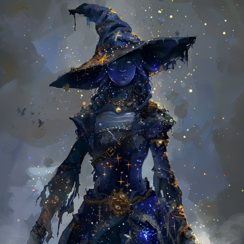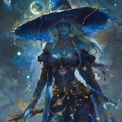 blue skinned, 4 armed lady, witch, with a big witch hat, fantasy, full body shot, clothes covered in stars and moons, pathfinder style, multiple arms