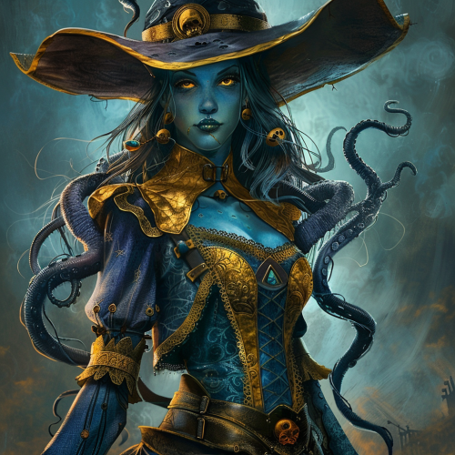 blue skinned, 4 armed lady, witch, with a big witch hat, with tentacles behind her back and yellow eyes, fantasy, full body shot