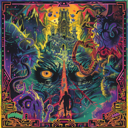 a brightly coloured and exciting hand-illustrated poster for a movie similar to Labyrinth or Dark Crystal, in which the Lament Configuration from Hellraiser is actually connected to a magical kingdom like Narnia or Wonderland.