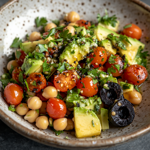 "Realistic high-quality close-up of a beautifully plated dish of [nome della ricetta], captured in natural lighting. The dish is presented on a rustic wooden table with subtle, fresh ingredients scattered around as garnish. The food is warm, fresh, and inviting, with visible textures and vibrant colors. The setting includes small touches, like a folded napkin, silver cutlery, and a glass of water in the background, giving the scene a cozy, appetizing feel." Salade de pois chiches : 150 g de pois chiches, 50 g de concombre, 50 g d’avocat et 20 g de feta, le tout arrosé d'une vinaigrette à l'huile d'olive. --ar 16:9