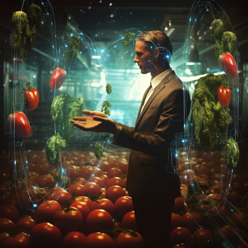 Flat graphics of pictures of tomatoes, cucumbers, bell pepper, succulents (blue and green or red and green), mushrooms, and flowers. large brand logo --s 750