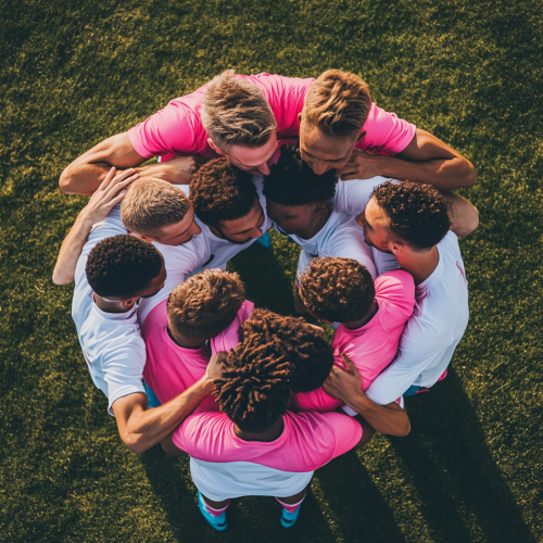 high resolution photo of a group of male athletes on a lawn hugging each other seen from above only their heads. white and fuchsia short sleeve sports shirts. solid color shirts no numbers