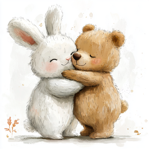 A cute cartoon drawing of two friends, one is an adorable white rabbit and the other a bear hugging each other with love. The artwork features simple lines, a vector style, pastel colors, simple shapes, a cute illustration, flat design, clipart, a white background, no shadows, a kawaii art style, high resolution, detailed, a watercolor effect, cartoon style, cute style, contour, in the style of Richard Scarry, high detail, a masterpiece. --q 2 --s 750