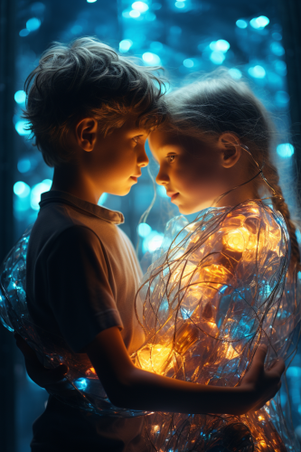 two children hugging a boy and girl in friendship friends friendship friendly in HoloEtherealDigitalGrids style, amidst a canvas of aquamarine and pearl white illuminated by neon fractals --ar 2:3 --s 250